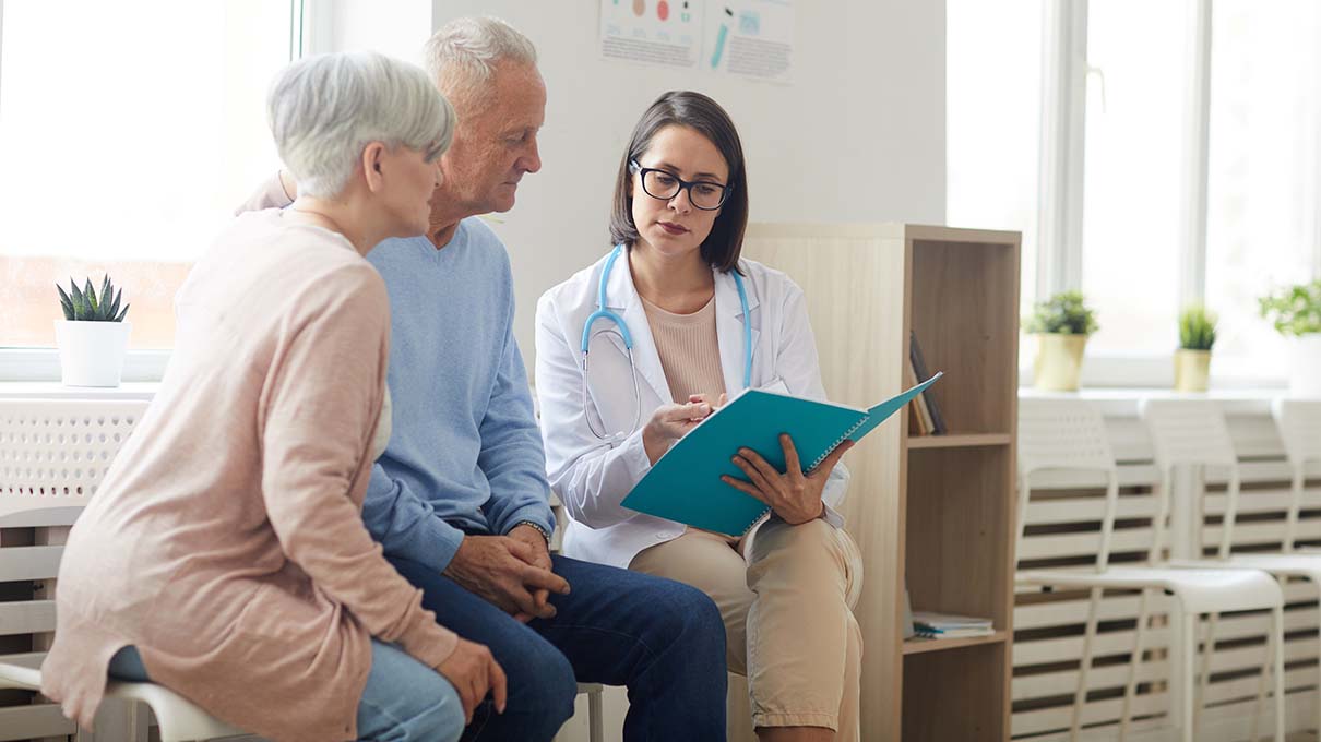 Eine Ärztin sitzt mit zwei älteren Personen auf Stühlen und zeigt ihnen etwas in ihren Unterlagen.